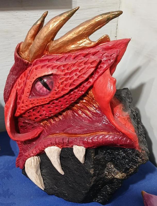 This sculpture is a relic and a roar, a head carved from fire and forged in story.